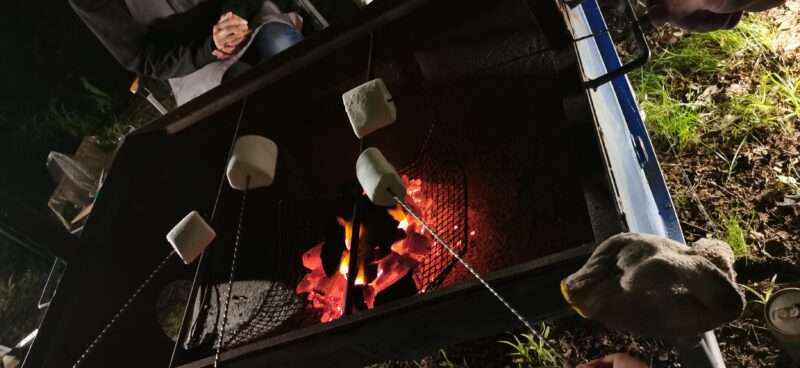 キャンプの〆は焼きマシュマロ!大きなマシュマロを焼いて食べたら、そのまま食べるような甘さが強くなく美味しくてびっくりしました!
